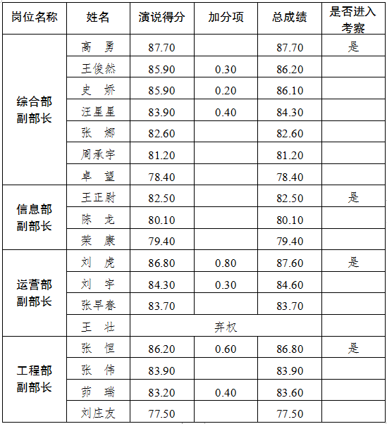 根據(jù)《宿遷交通集團(tuán)所屬單位2022年度中層管理人員競聘實(shí)施方案》的安排,競聘演說工作已經(jīng)結(jié)束,現(xiàn)將競聘總成績及進(jìn)入組織考察人員名單公布如下。